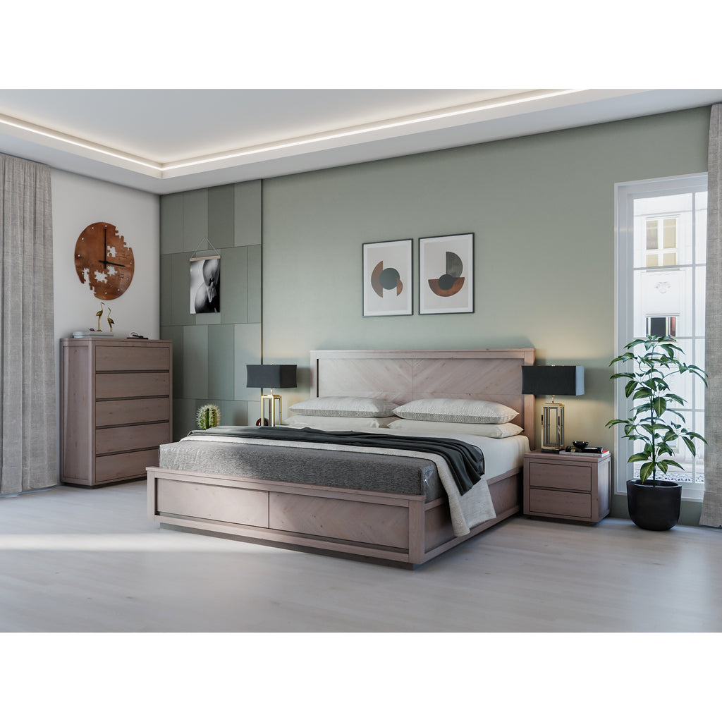 A gorgeous bed elevates the beauty of a bedroom naturally. Decorate your private retreat with this magnificent queen bed and take your bedroom's charm to a new level. It features Herringbone design, showcasing beautiful geometric pattern highlighting the natural grain of the wood and this makes each furniture piece look unique. The bed is made of sustainably harvested solid and veneer messmate due to which the bed frame is light yet robust and resilient. It resists moisture as well. The bed in natural colour with a clear lacquer finish looks stunning in practically any interior decor scheme.The bed is designed in the Scandinavian-style, featuring innovative wood pattern and natural colour accents. Beautiful wood pattern on the headboard and footboard gives it a special beauty that attracts at first glance. Slats and a wood beam give the bed extra strength and load-bearing capacity. The easy-to-assemble Queen Bed comes with a one-year warranty.