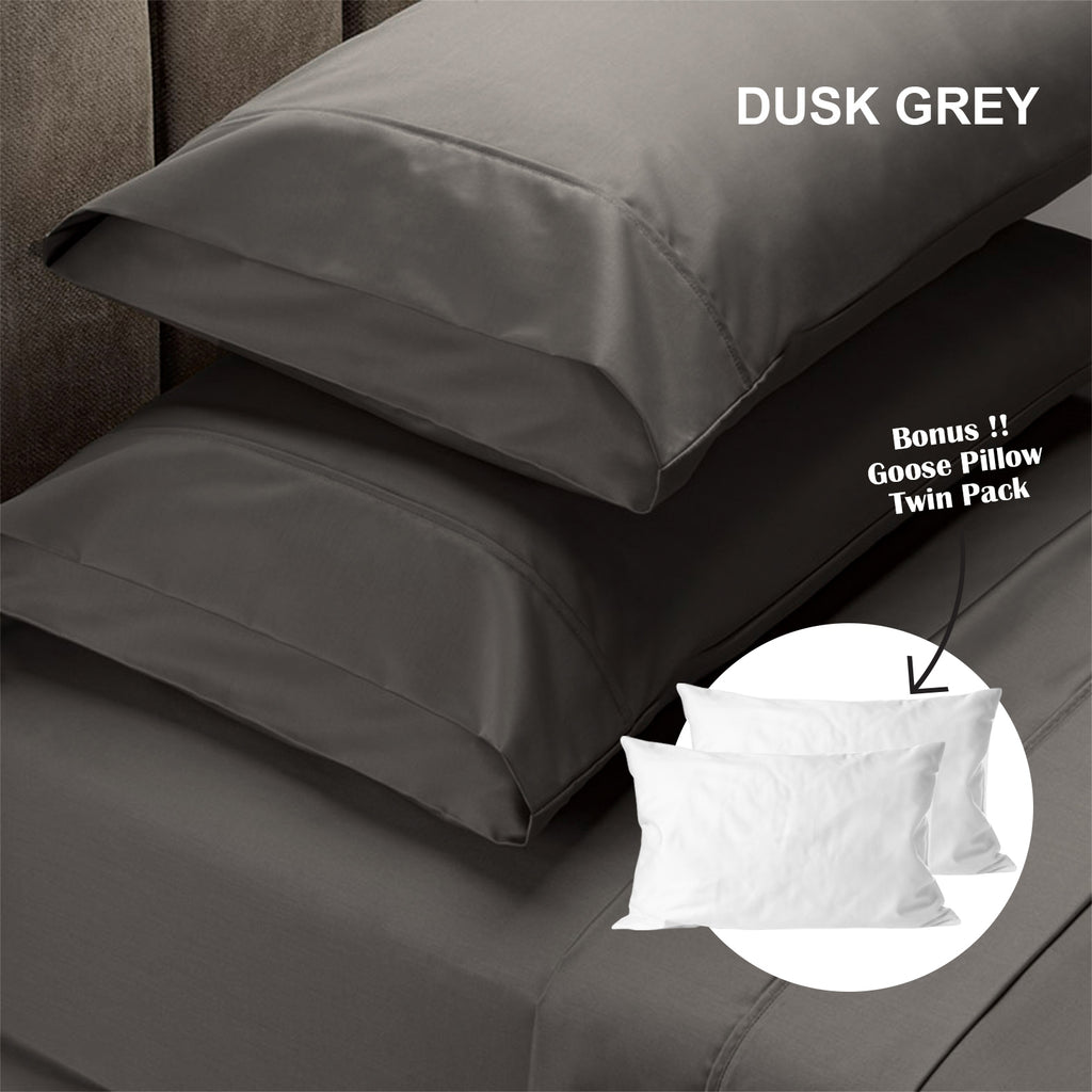 Royal Comfort 4 Piece 1500TC Sheet Set And Goose Feather Down Pillows 2 Pack Set - Double - Dusk Grey