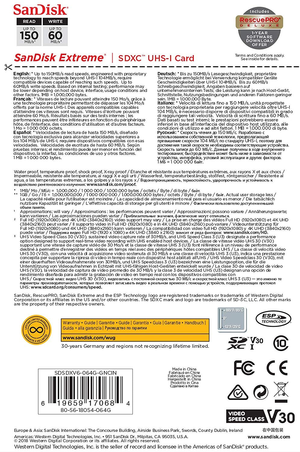 1 x SANDISK SDSDXV6-064G-GNCIN SDXC Extreme CL10 V30 UHS-I/U3 150MB