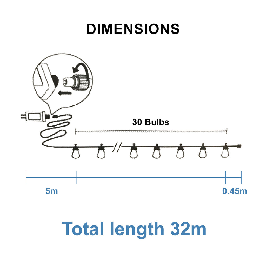 Sansai 32M Festoon String Lights LED Waterproof Outdoor Christmas Party 30 Bulbs