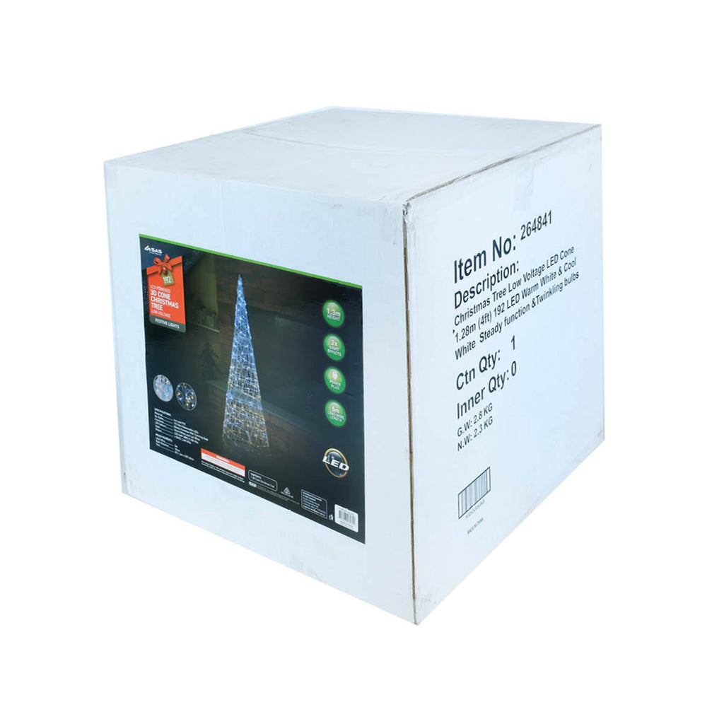 SAS Electrical® Illuminate your surroundings with this decorative 3D cone Christmas tree. Power operated this tree elegantly gives off warm and coolwhite lighting with 2 light functions. A gorgeous addition to your home, living areas, business and shop front during the festive season.