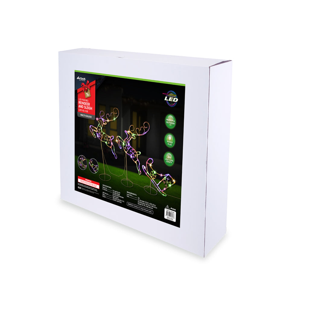 SAS Electrical® Illuminate your indoor or outdoor space with this reindeer and sleigh set. Fitted with 76 multi-colour changing LED lights, this display is durable and weather resistant. Your indoor and outdoor spaces will look dazzling during the festive season.
