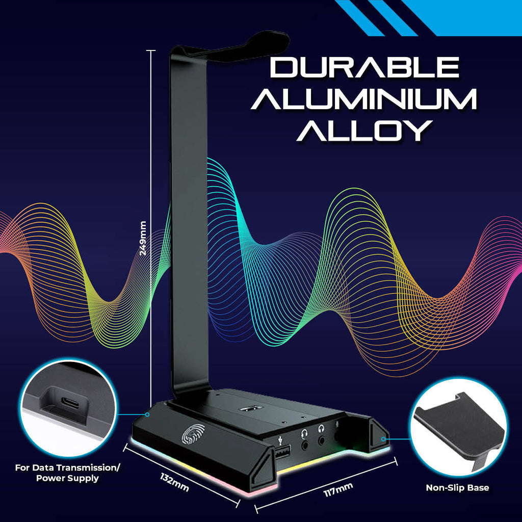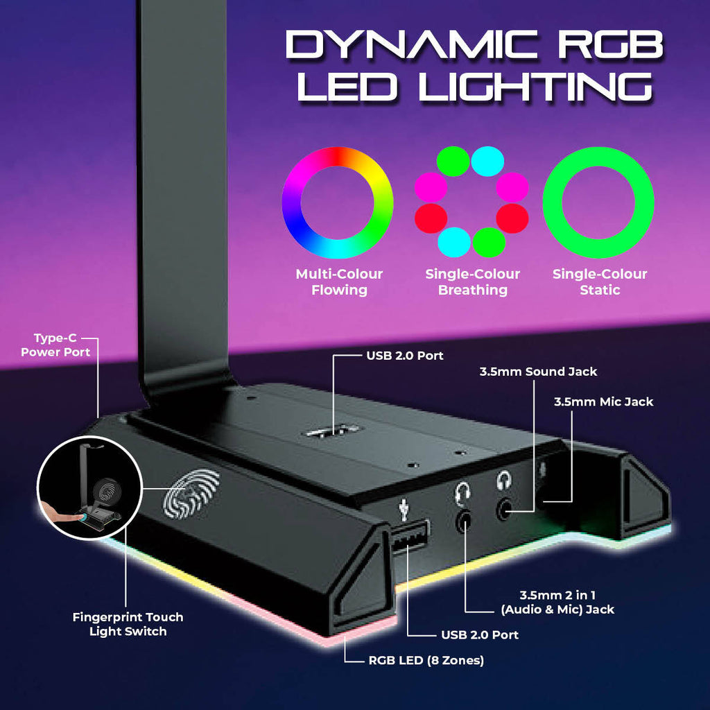 SAS Gaming SGW1 Headset Stand & Docking Station is a must for any RGB gaming or office setup to safely store your headset or headphones in style. The SGW1 Headset Stand/Dock is made of sleek, black aluminimum alloy that is durable yet lightweight and features 7.1 Virtual Surround Sound on any 3.5mm or USB analog headset for a truly immerive experience. It is simple to assemble and compatible with any sized headset. With Touch Controlled Dynamic RGB LED Lighting in 3 available colour modes (Static, Breathing or Flowing), this headset stand/dock is easily customizable to match your other RBG accessories, or add a touch of colour to your desktop. To save precious desktop real-estate and add extra connectivity, this versatile headset stand comes with Dual USB 2.0 ports, a 3.5mm Audio Jack, a 3.5mm Mic Jack and a Dual 3.5mm Audio + Mic Jack to perfectly suit your headset or headphone/microphone set up.