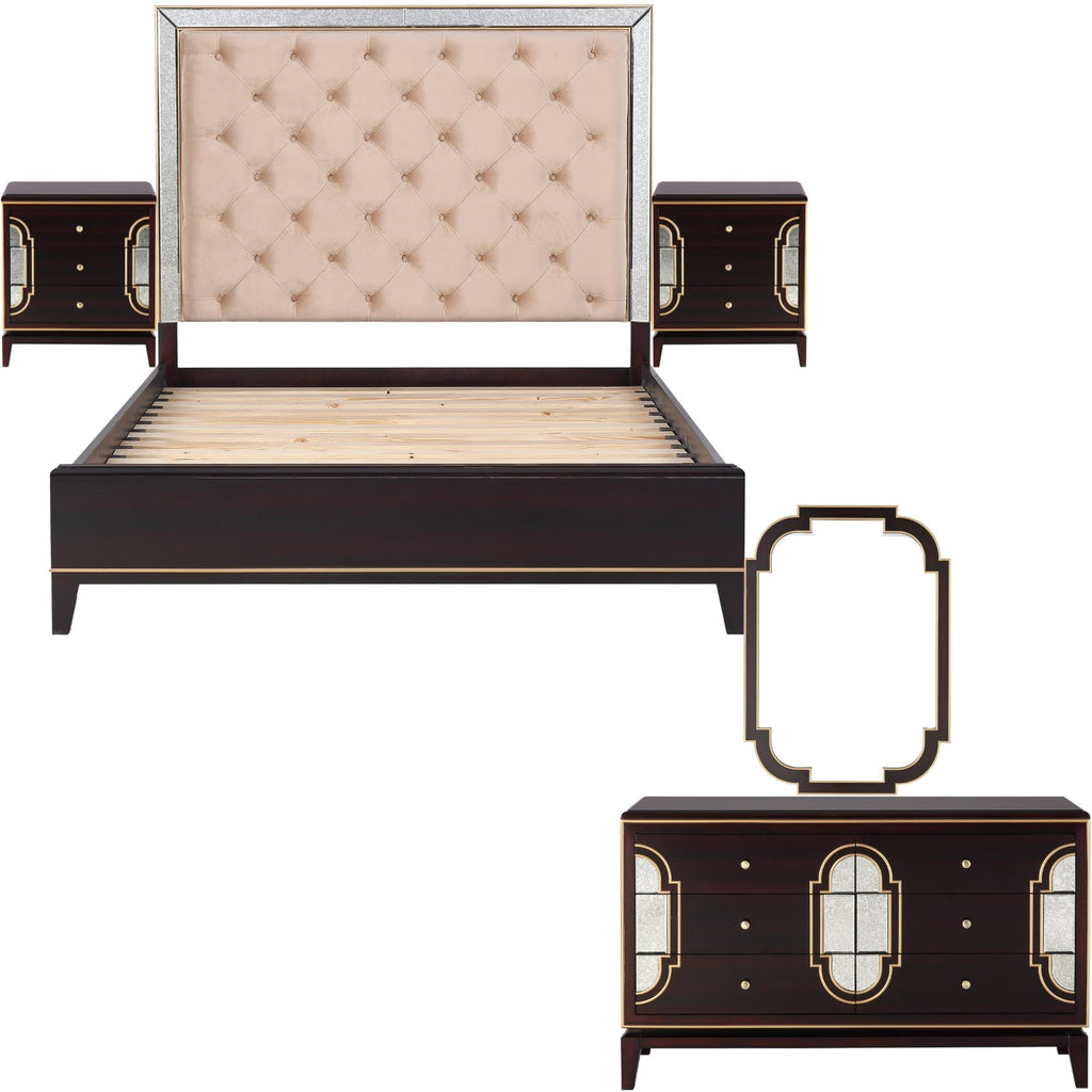 The colours in a bedroom should make you feel at ease. Fill your bedroom with Cherry and Antique Mirror colours by decorating it with this lovely queen bed, dresser-mirror suit.An Art Decor inspired suite designed in the traditional style gives a relaxing feel to your bedroom. The colours make an elegant light-reflecting statement for the entire collection. The suite has one queen-size bed, one dresser with 6 drawers, one annealed glass mirror, and two immensely beautiful nightstands with 3 drawers each- solving the storage space problem in your bedroom. The suite has been crafted to a high quality specification with 4mm mirror glass. Wall mirror can be placed either horizontally or vertically. All the drawers have full-extension metal runners, beautiful knobs, and are lined in black felt for an added touch of luxury. The drawers also have a brushed brass-look finish to coordinate with the hand-painted gold trim, adding to their aesthetic appeal.The bed features 3 adjustable support legs and a luxurious deep-buttoned headboard upholstered with Polyester Velvet Fabric. The whole furniture collection is made of solid timber: Cherry Veneer, Birch MDF, harvested in a sustainable way. The wood combination provides the furniture pieces with great strength and resilience. The MDF wood is resilient to moisture damage. The sleek suite goes with a variety of interior decor styles and comes with a one-year warranty. The bed and dresser legs need to be assembled in the entire suite.
