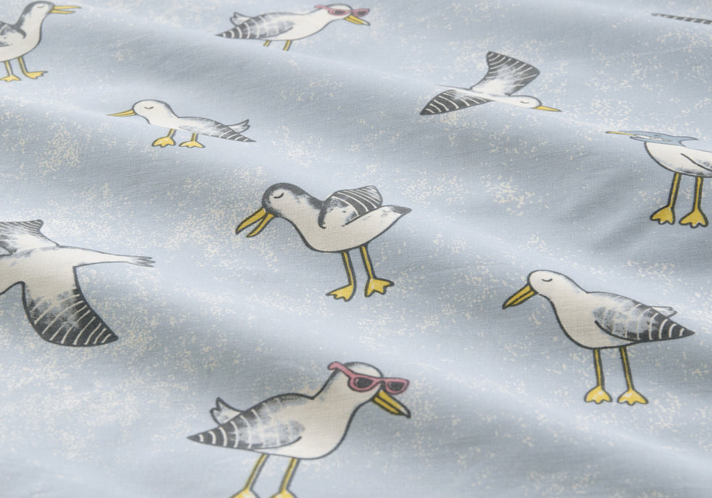 Continue a fun filled day at the beach at home (without the sand!) Seagulls Quilt Cover Set features an inviting pastel blue and a quirky design of seagulls invoking play joy into your little ones room.