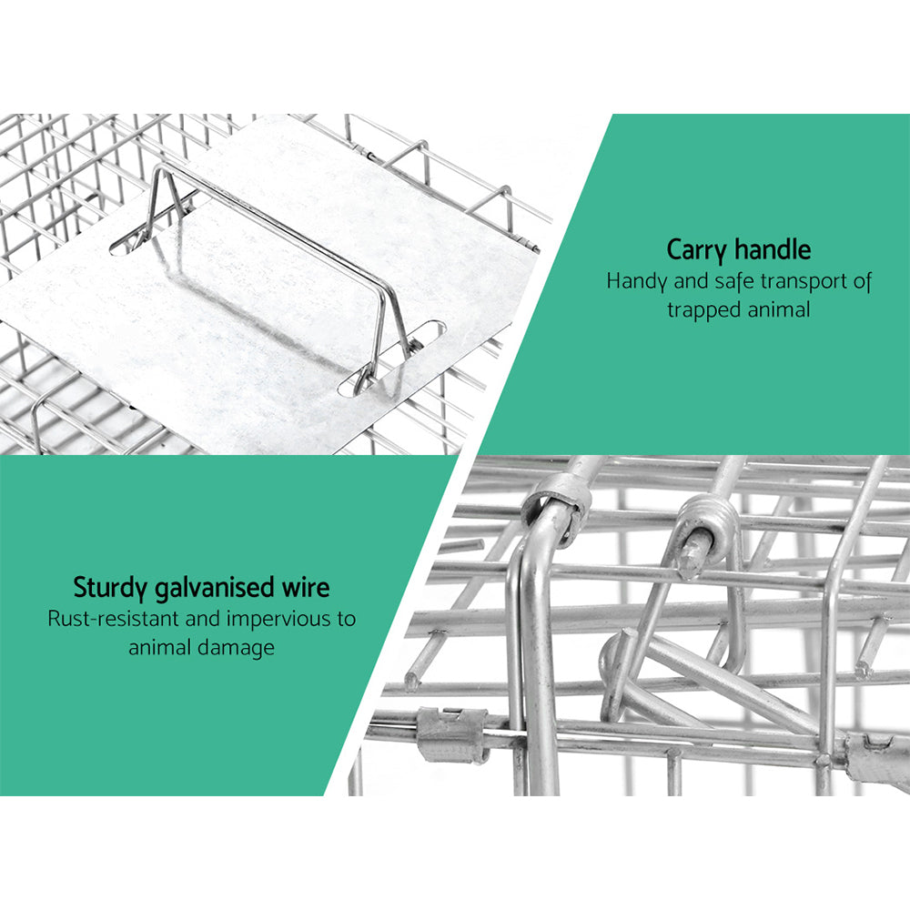 Made from quality rust resistant galvanised iron wire, these humane animal trap cages are built to last for years. Featuring a spring loaded door trap with protected handle and an automatic locking system that is swift in operation; these cages are designed to ensure safety of both animals and users. Perfect for removing pest animals in backyards and capturing pests alive. It's collapsible design can fold away quickly for easy storage and transportation.