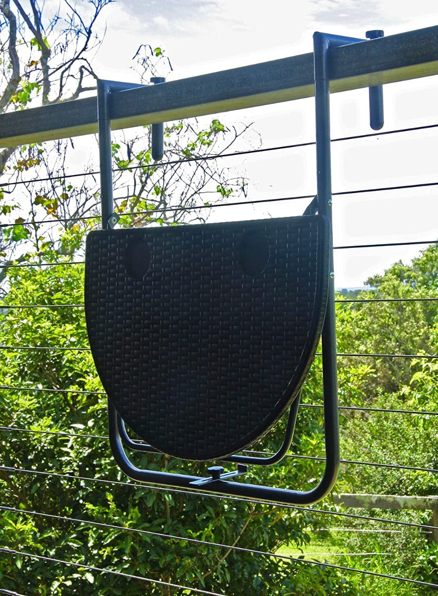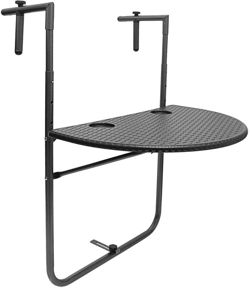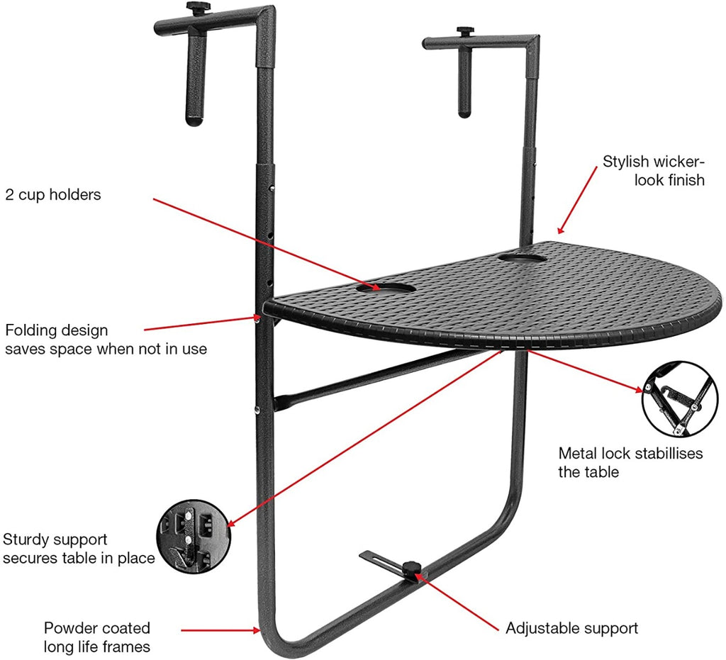 This table is ideal for balcony living. The stylish wood grain finish design sits over top of the railing to be used as a table or a shelf.