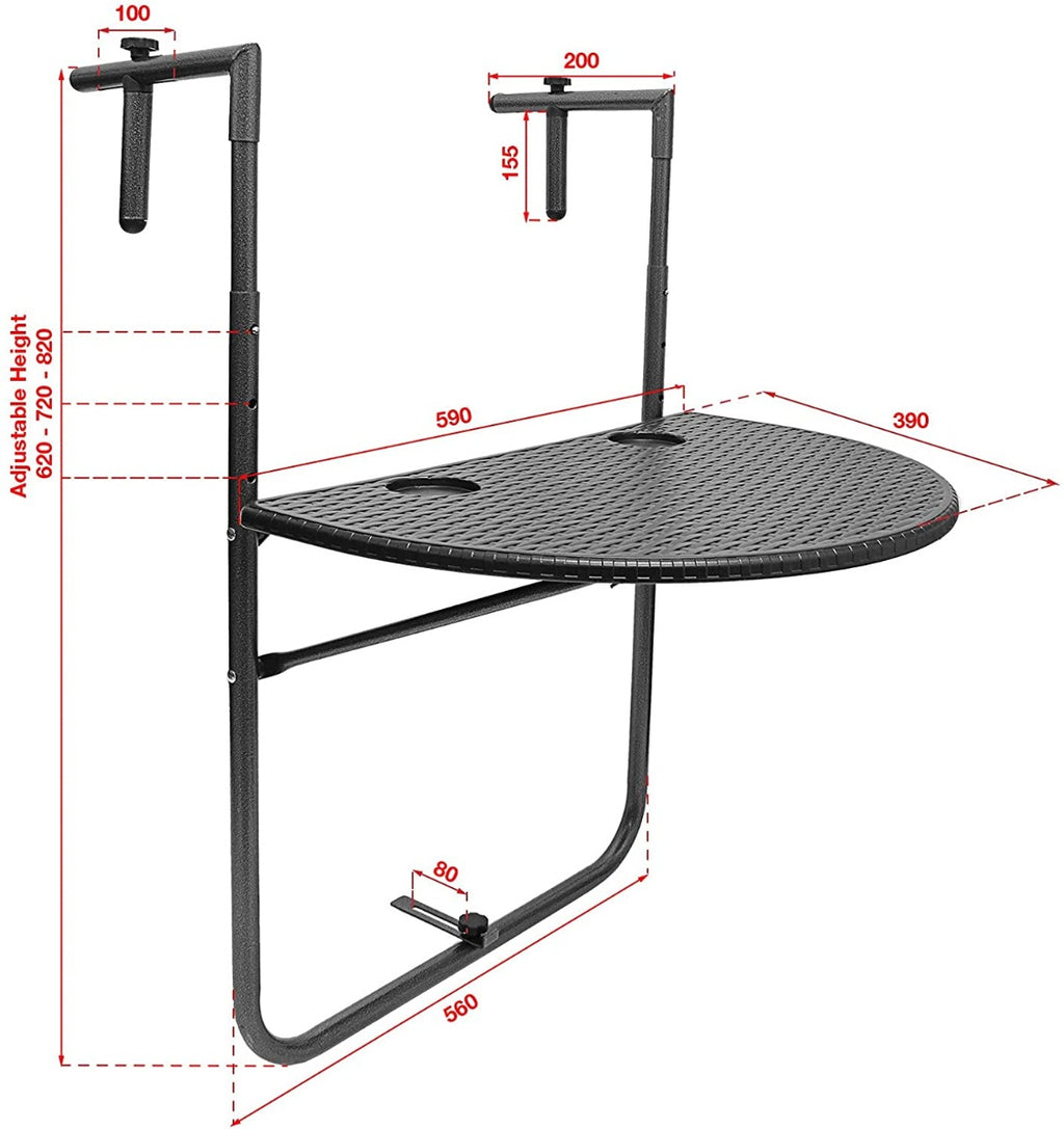 The table can be adjusted for different heights and railing widths: 65mm - 160mm
