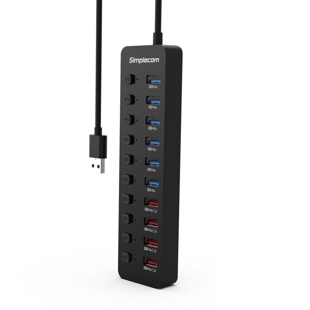 Simplecom CHU810 48W 10-Port USB 3.0 Hub and Charger with Individual Switches 12V/4A Power Adapter BC 1.2 Fast Charging