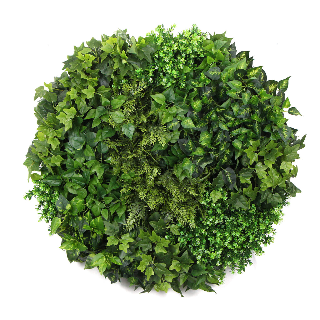 This beautiful indoor artificial green wall disc is the perfect way to add a touch of stunning greenery to any space. Never worry again about maintaining living plants, or having to water your garden with this high-impact instant green wall.