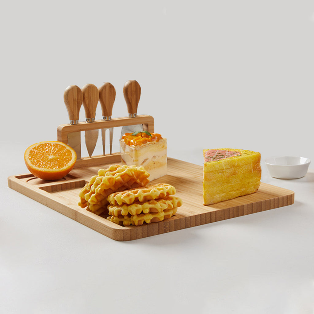 - CONVENIENTLY SLEEK: A sophisticated-designed cheese board tray with serving utensils knife set: these trays feature stainless steel blades and easy-grip bamboo handles to dazzle your guests with a sumptuous sharing platter.