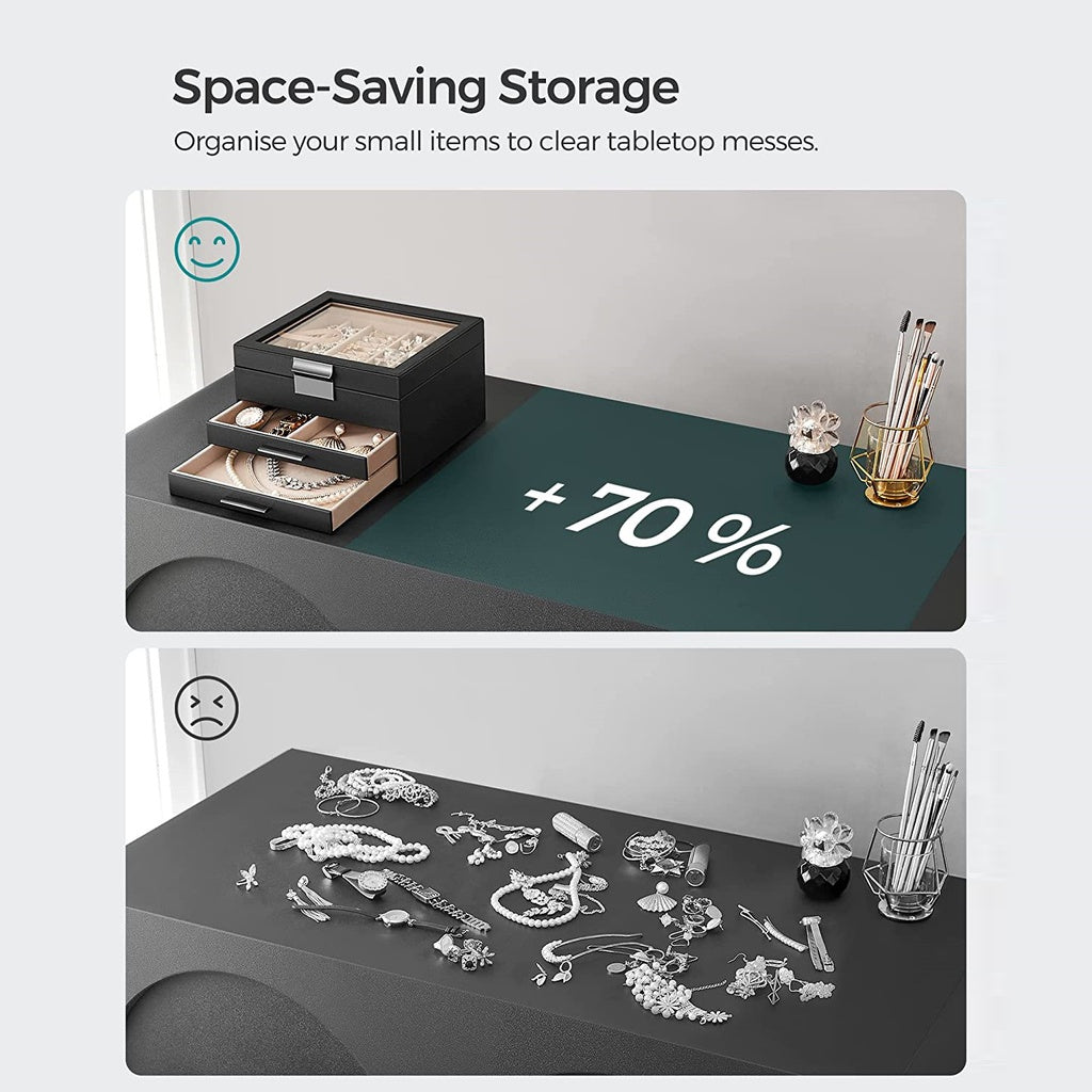 No more hunting through messy drawers for the right pieces before going to work or having a fun night out. With this jewelry organizer with glass lid, you can store the accessories you often wear under the glass lid for easy access. Also, there are 2 drawers in different layouts to keep the items you don't want to show off.