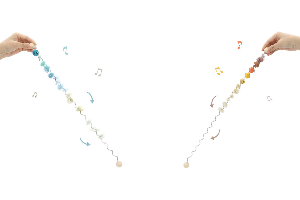 Hold the spirelli upright, then turn upside down and watch the wooden rings cascade down the spiral making a cool whooshing sound as they go. A captivating yet simple toy for the little ones.