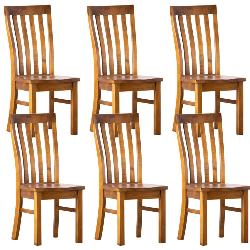 Use this lovely 6-piece set of wooden dining chairs with a tilted backrest to add a classic look to your living room. The chairs, designed in a modern rustic style, effortlessly beautify your living room. The chairs' rustic oak finish complements almost any interior decor setting. They have a distinct appearance due to their strong, straight front legs and curvy back legs. The chairs are made of solid pine wood, harvested in a sustainable manner. The wood is well-known for its aesthetically pleasing appearance, strength, and durability. A one-year warranty is included with the fully assembled dining chairs.