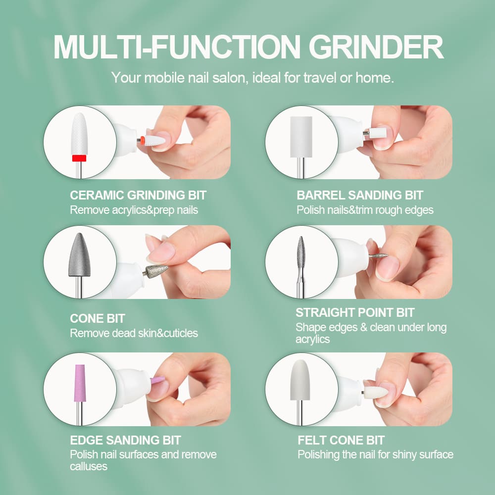 With 6 different kinds of high-quality bits, you can use this nail drill machine for all-round grinding, shaping, cutting, polishing, removing cuticles. The newly upgraded high-efficiency Ceramic Corn Head performs well in removing Gel Polish. It takes less than 1min to break down the gel.