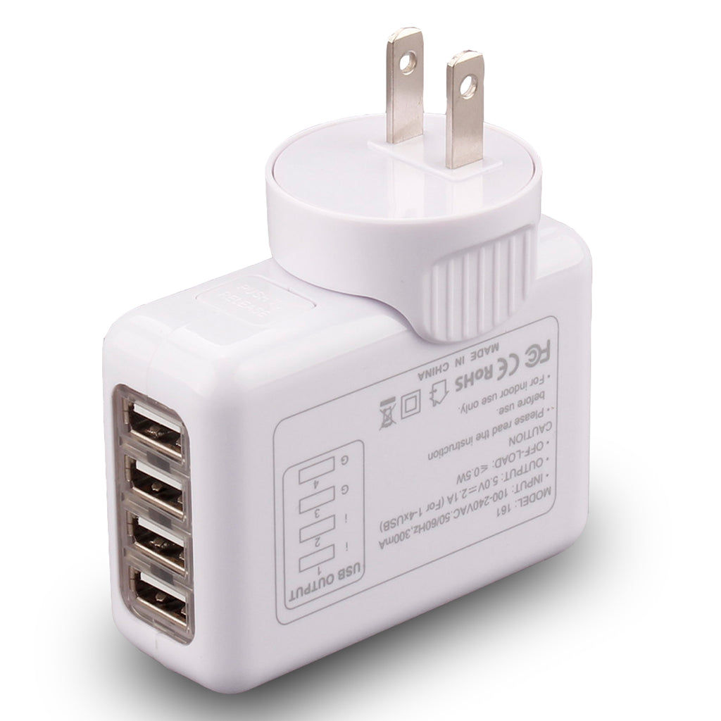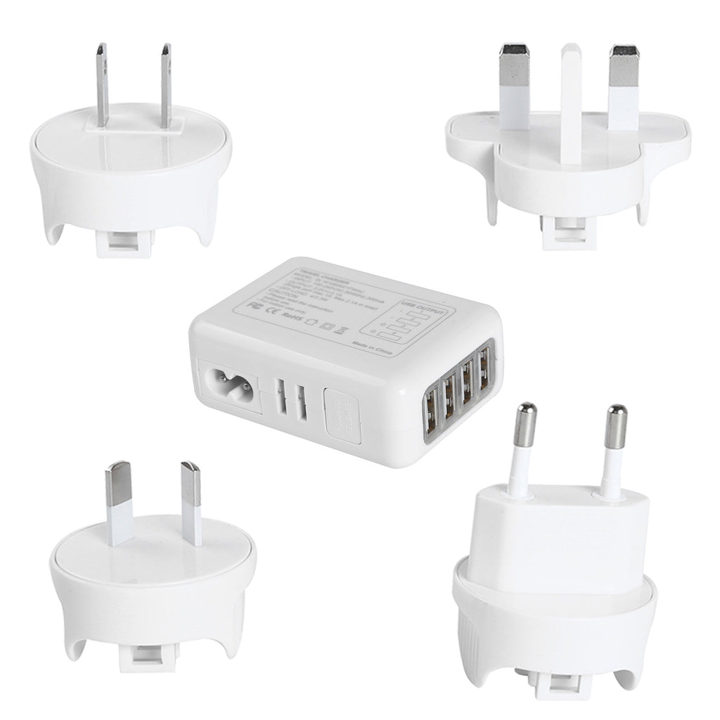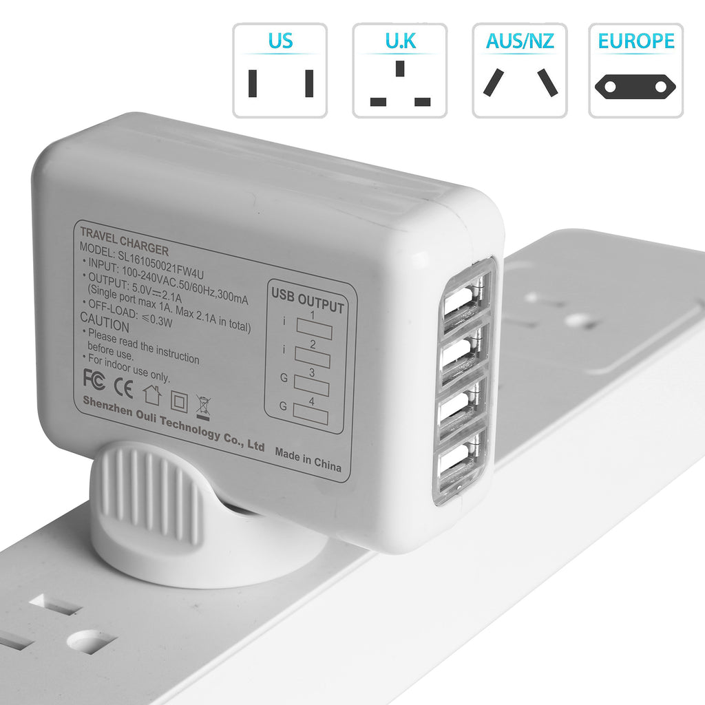 It features 4 interchangeable international power point heads (US/EU/AU/UK) to eliminate the need to carry multiple wall chargers and outlets.