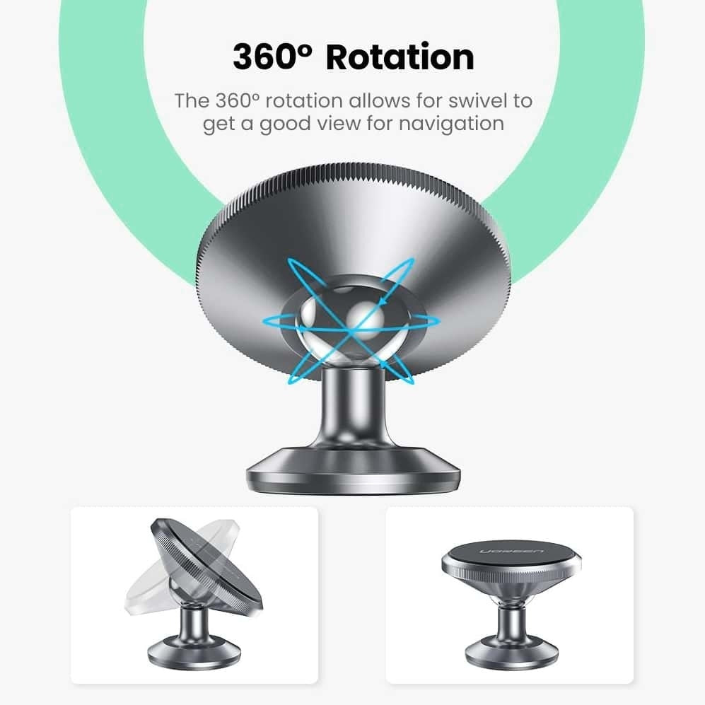 This UGREEN magnetic car mount allows you to place your phone on the dashboard over the steering wheel for hands-free navigation, phone calls, and music entertainment which offers a safer driving experience for you. 360 degree rotation. Neodymium magnets.