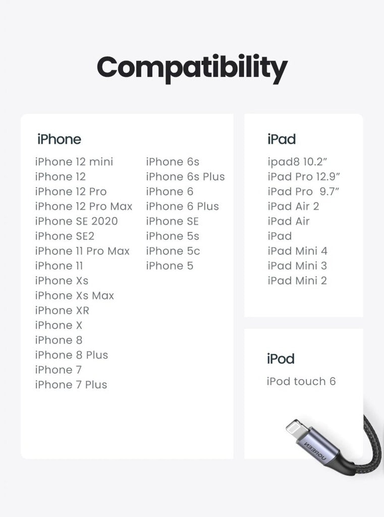 UGREEN iPhone Charger cable compatible with New iPhone 12 mini/12/12 Pro/12 Pro Max, iPhone 11/11Pro/11 Pro Max / iPhone XS Max/ XS/ XR/ X/ 8/ 8 Plus/ 7 plus/ 7/ 6s Plus/ 6s/ 6 Plus/ 6/ iPad Air/ iPad mini/ iPad Pro/ iPod Touch/ iPod nano 7th gen/AirPods, and more.