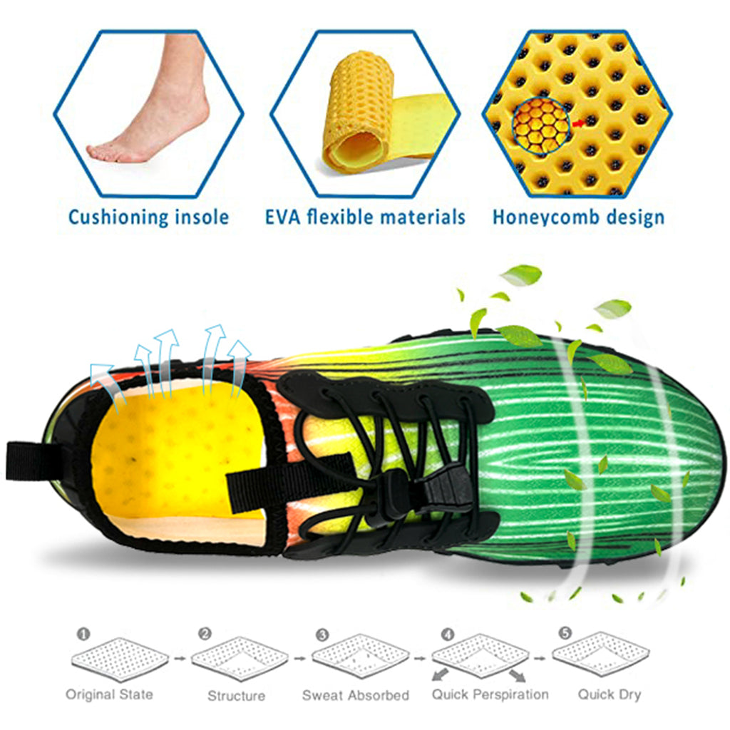 QUICK DRY DRAINAGE SYSTEM: Each bottom of these water shoes has several holes to ensure proper water outflow. It can quickly drain and cross-ventilate, preventing stuffy feet, foot slip, providing excellent flexibility and comfort. These holes are not big enough for sand or rocks to enter.