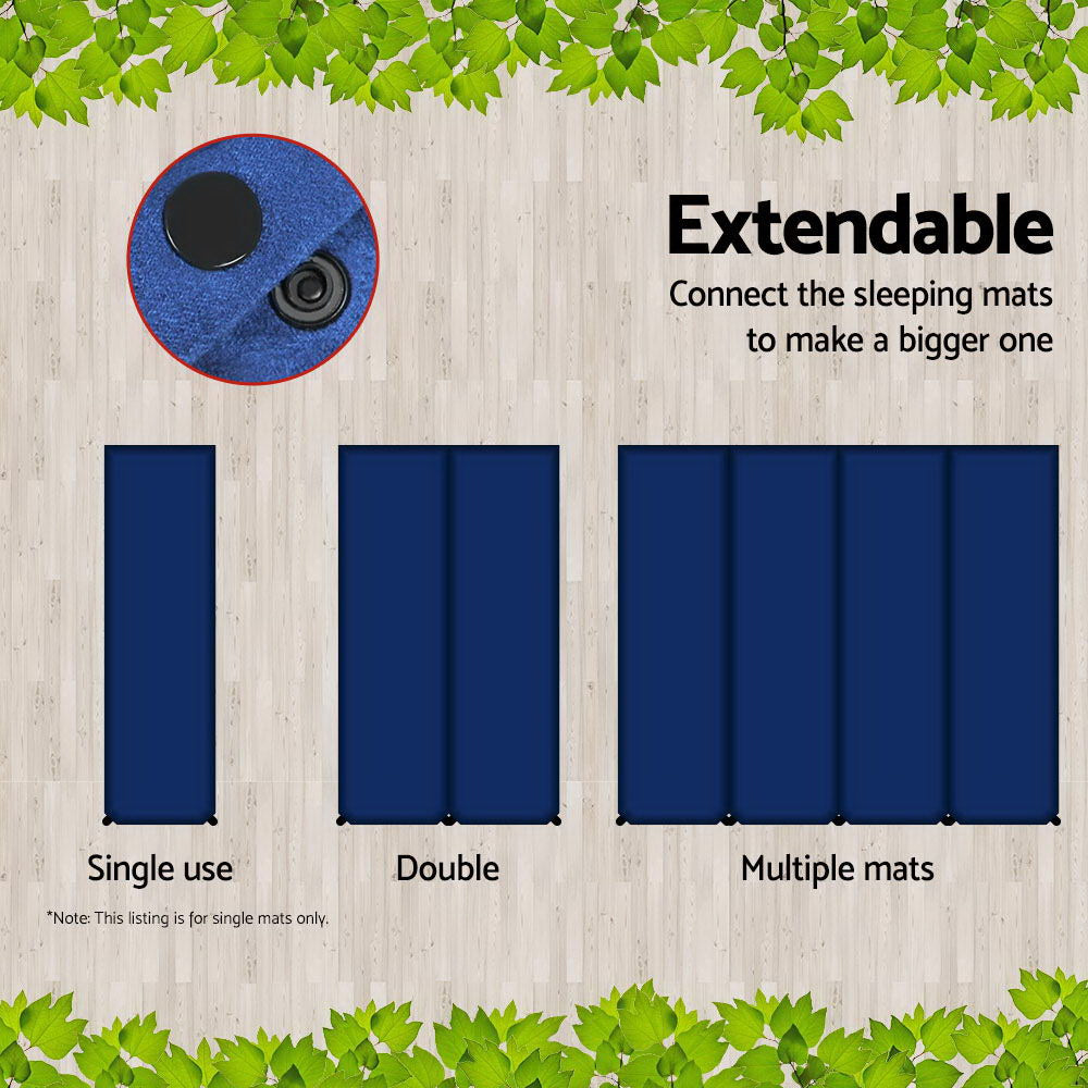 Made of high density 6cm thick polyurethane foam, this self-inflating mat offers great sleeping comfort at camping site. With anti-slip polyester pongee bottom and PVC coating, the mat is suitable for all ground surfaces. With joinable buttons on the sides of the mat allowing you to join multiple mats together. Equipped with 2 efficient self-inflating valves at the end of the mat, it only takes 60 seconds to inflate. Ready in a minute!