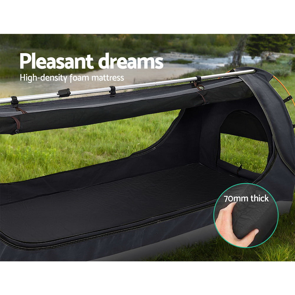 A 14oz 400gsm water-repellent Ripstop canvas cover, 500gsm PVC flooring and 10cm high edges all round. Swagspeak for the ultimate tear-resistant waterproofing. Fully enclosed for privacy with zipped openings for fresh air anytime. Mesh panels to keep insects out. A 70mm high-density foam mattress for better sleep on any surface. Thick aluminium spreader poles to hold the entire set up.