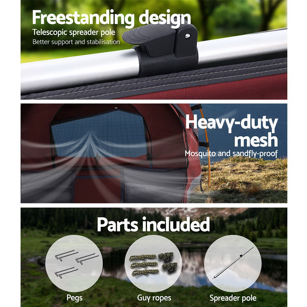 A 14oz 400gsm water-repellent Rip stop canvas cover, 500gsm PVC flooring and an extra 10cm high edge all round. Swagspeak for the ultimate tear-resistant waterproofing. Fully enclosed for privacy with zipped openings for fresh air anytime. Mesh panels to keep insects out. A 70mm high density foam mattress for better sleep on any surface. Thick aluminium spreader poles to hold up the entire set up.