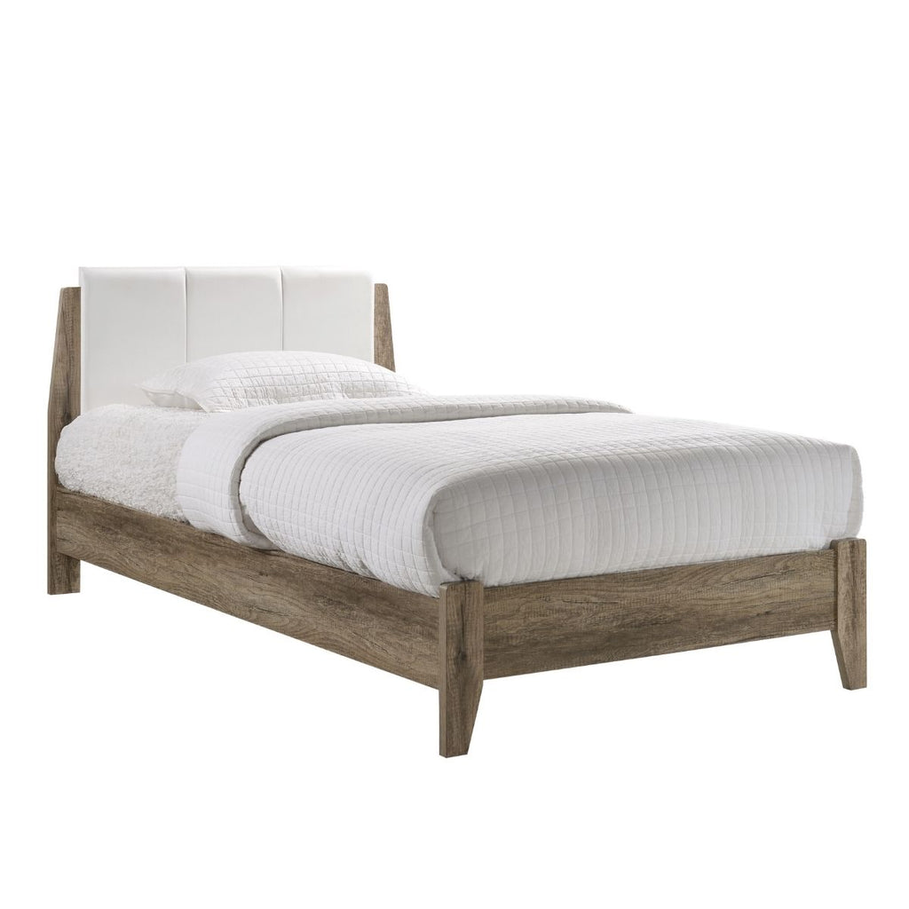 The panel-tufted headboard design comes in white leather upholstery for warm and cozy appeal. It's an elegant combination that complements the wooden texture of the frame as well.