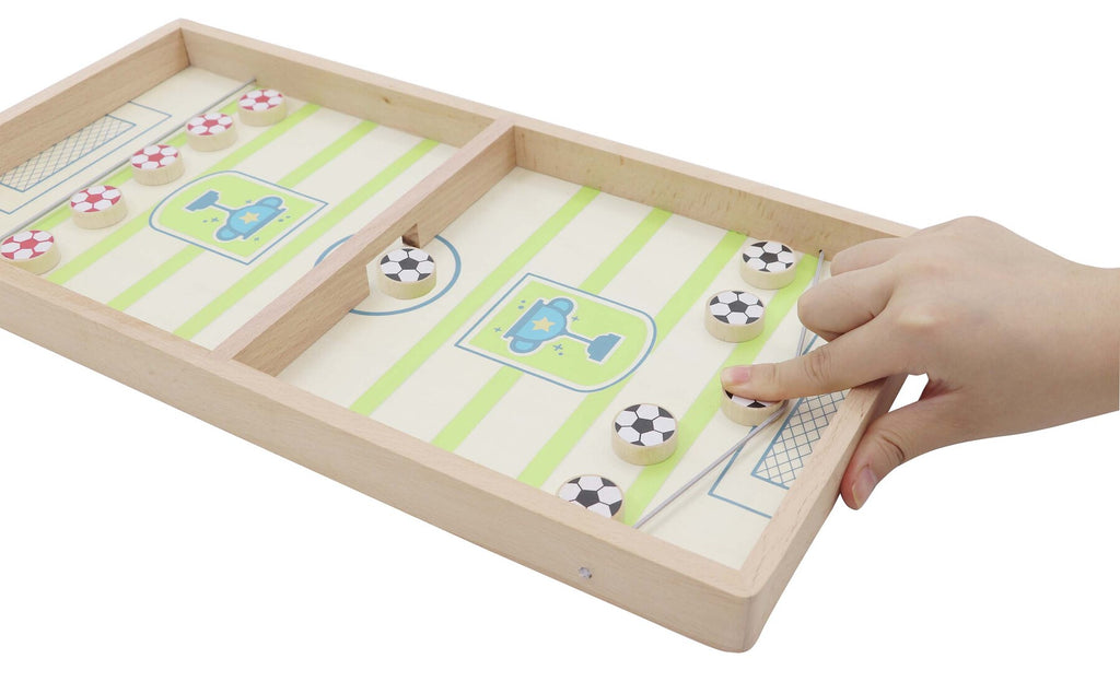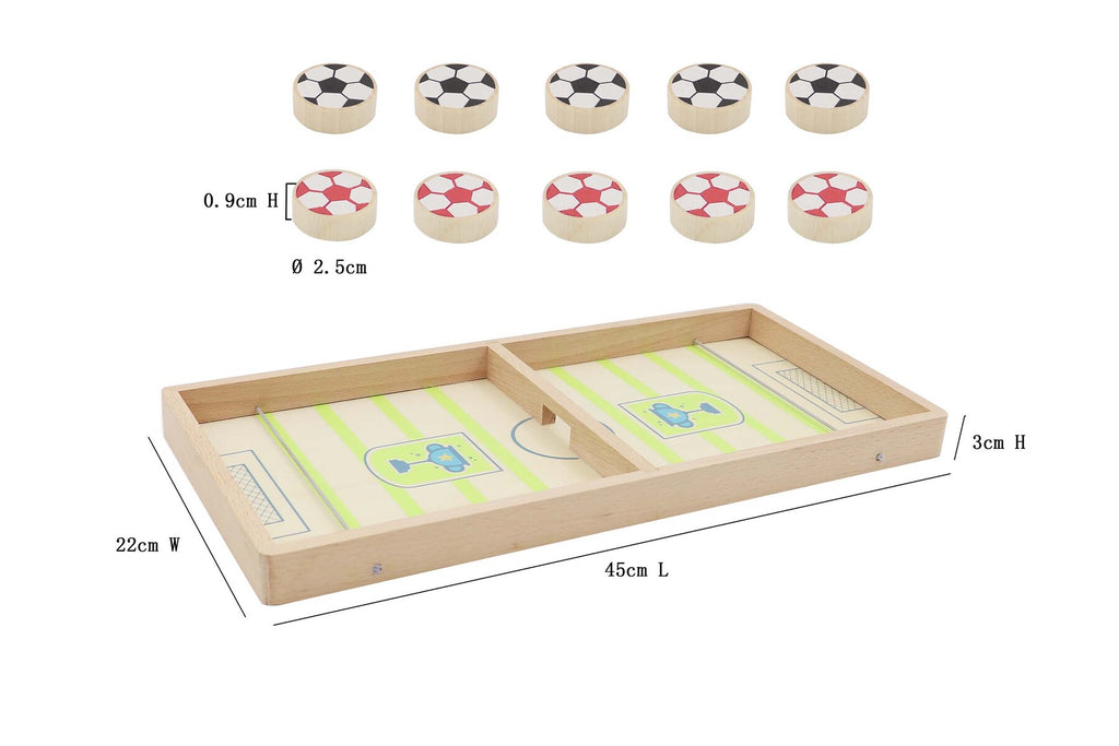 Sturdy wooden table game. Use the elastic sling launcher to propel your soccer ball discs. The aim is to see who can be the first player to get all their discs into the other player's half. It's fast, frenetic and fun.