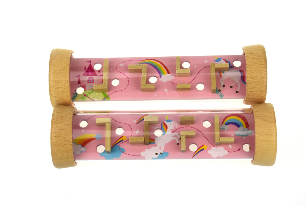 This is a unique double-sided maze, the objective of this game is to have the ball follow the track by turning the tube. Avoid falling through the hole. Promotes concentration, hand and eye co ordinations. This wooden maze will keep the kids busy for hours.